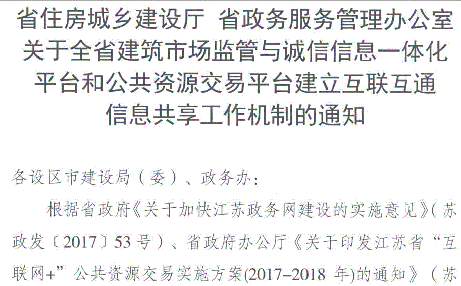 省住房城乡建设厅省政务服务管理办公室关于全省建筑市场监管与诚信信息一体化平台和公共资源交易平台建立互联互通信息共享工作机制的通知