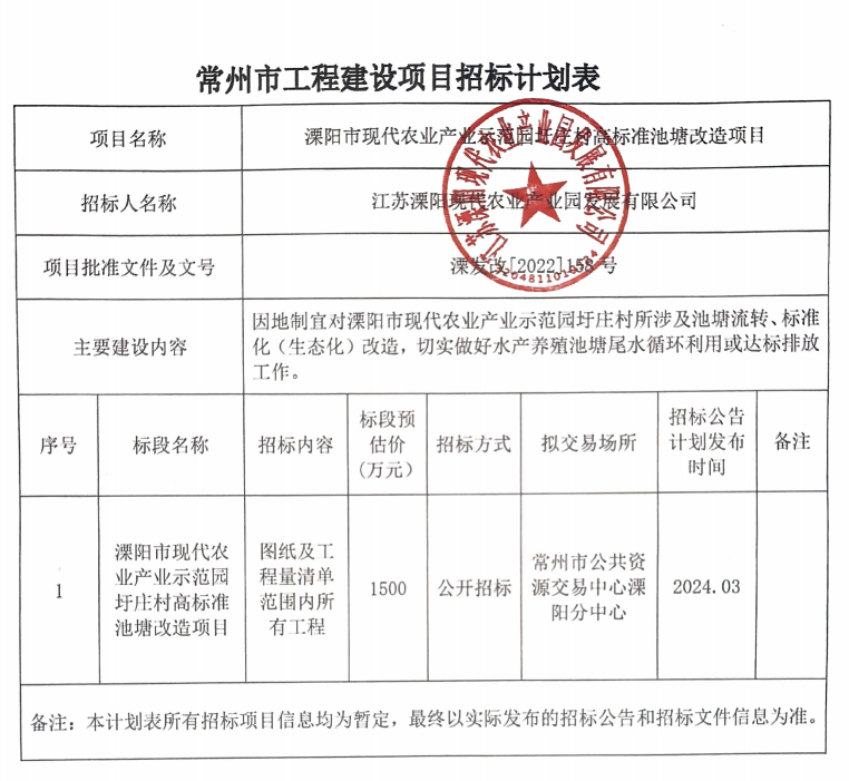 溧阳市现代农业产业示范园圩庄村高标准池塘改造项目招标计划