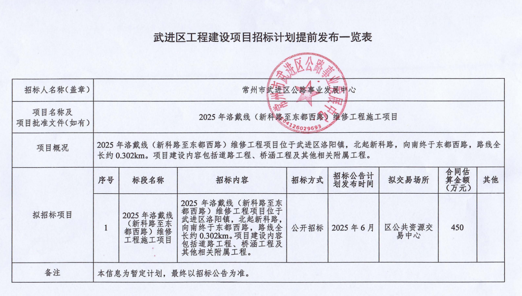 武进区工程建设项目招标计划提前发布一览表(2025年洛戴线(新科路至东都西路)维修工程施工项目).pdf